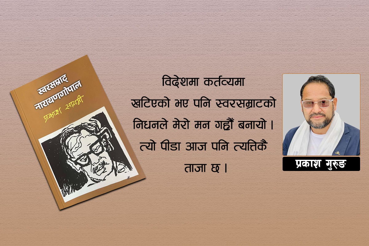 छोटो समयअघि मेरो भाइ नवीन गुरुङ नेपाल गएका थिए । उहाँमार्फत मलाई प्रकाश सायमीले लेख्नुभएको ‘स्वरसम्राट नारायण गोपाल’ नामक पुस्तक ल्याइदिन अनुरोध गरेँ । पुस्तक हात पर्यो । धन्यवाद भाइ । अझ भाइले पुस्तकको मूल्य लिन पनि मानेनन् ।