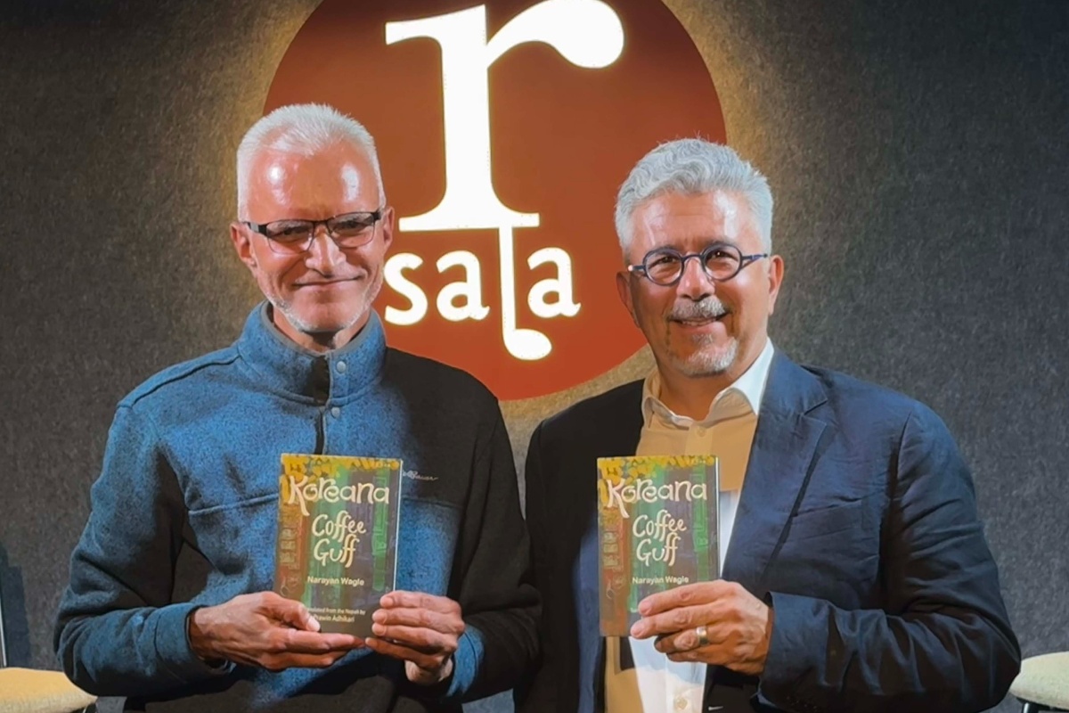काठमाडौँ । नारायण वाग्लेको पुस्तक ‘कोरियाना कफी गफ’को अंग्रेजी अनुवाद लोकार्पण गरिएको छ। बुधबार काठमाडौंस्थित आरशालामा लेखक वाग्लेले एडअर्डो रिनकनलाई अनूदित पुस्तक उपहार दिएसँगै पुस्तक लोकार्पण गरिएको हो।